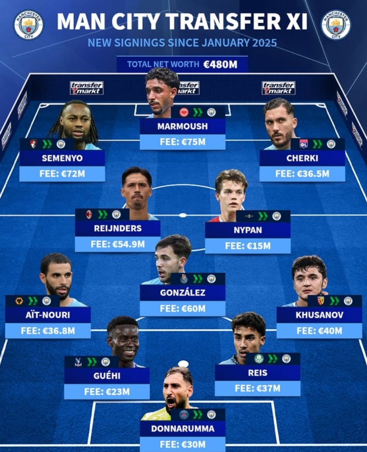 曼城1年内豪掷4.8亿买套首发:塞梅尼奥、格伊领衔,多纳鲁马在列