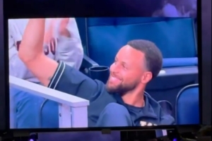 比赛期间,大屏幕找到了勇士当家球星库里,坐在妻子阿耶莎身边的库里高兴得像个孩子,挥手向观众示意。